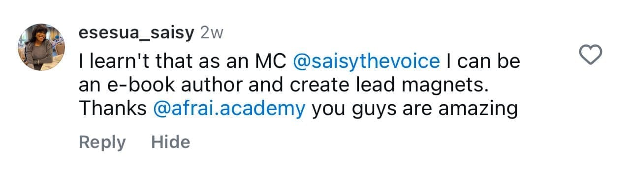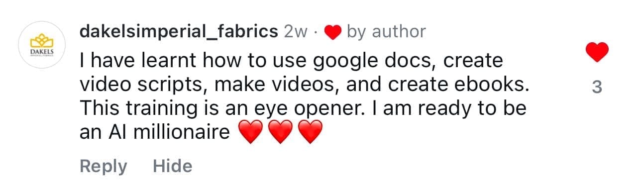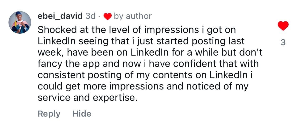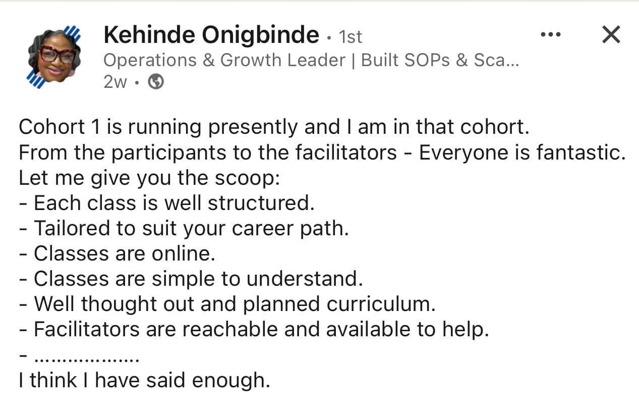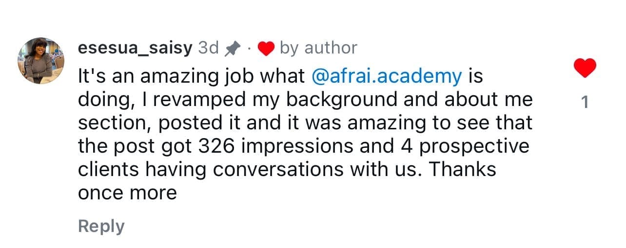 The training showed me how to create content for my brand. I just got a client on LinkedIn as a result of my post and optimized profile.